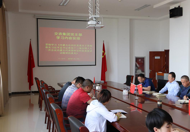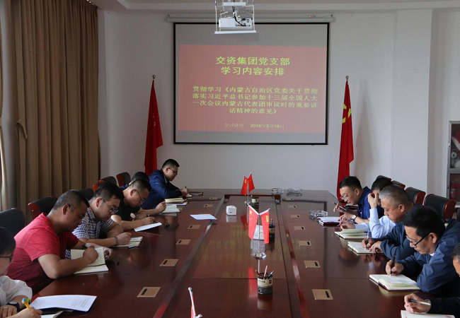 2018年5月18日星期五上午,交資集團(tuán)黨支部組織學(xué)習(xí)了《內(nèi)蒙古自治區(qū)黨委關(guān)于貫徹落實(shí)習(xí)近平總書記參加十三屆全國(guó)人大一次會(huì)議內(nèi)蒙古代表團(tuán)審議時(shí)的重要講話精神的意見》。會(huì)議由集團(tuán)工會(huì)主席孔祥軍同志主持,黨員及入黨積極分子參加了此次學(xué)習(xí)。