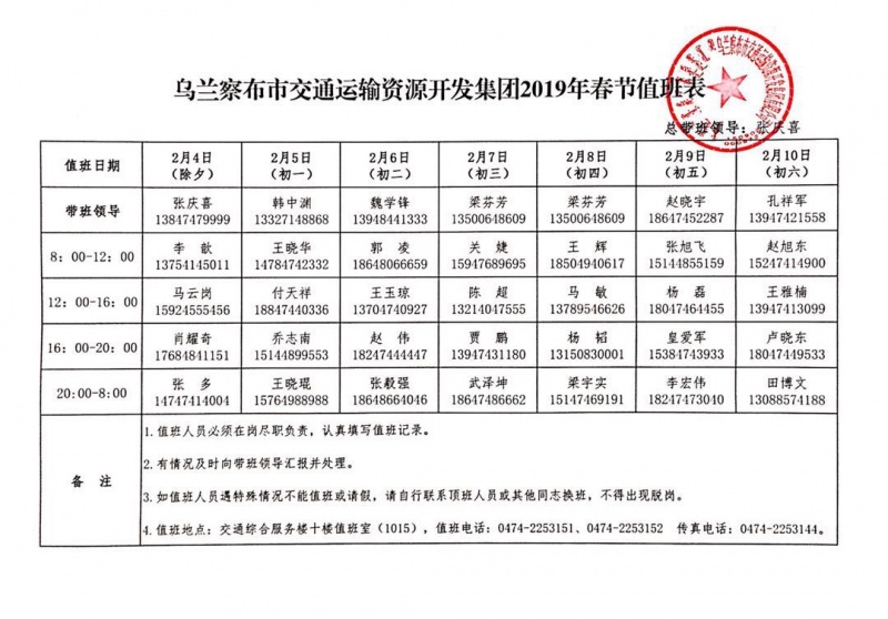 烏蘭察布市交通運(yùn)輸資源開發(fā)集團(tuán)2019年春節(jié)值班表